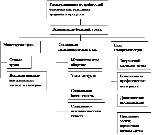 Итак, с точки зрения работника, его потребности могут быть выражены через функции труда, которые он (т.е. труд) выполняет по отношению к человеку как участнику конкретного трудового процесса. Эту систему целей структурно можно представить следующим образом (рис. 2).