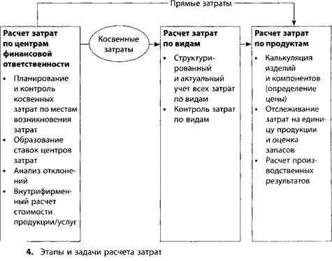 Ниже речь будет идти лишь о системах расчета затрат, и это необходимо понимать как краткое обозначение, включающее и аспект объемов производства — как, например, в расчете сумм покрытия (термин и задачи расчета объемов производства см.: Manuel, 1990, S. 45 ff). Рассмотрим сначала этапы расчета затрат (рис. 2.4).