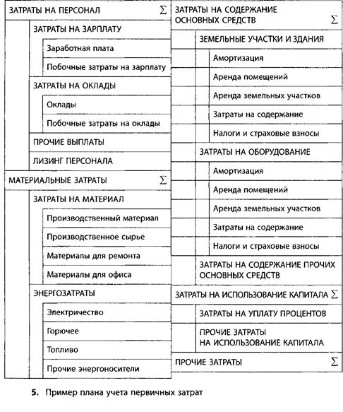 Для структурирования первичных затрат, или видов затрат, в качестве критерия различия задается вопрос о виде использованного производственного фактора. Таким образом, возникает примерное разделение по видам затрат, например: материальные затраты, затраты на персонал и затраты на оборудование (рис. 2.5).
