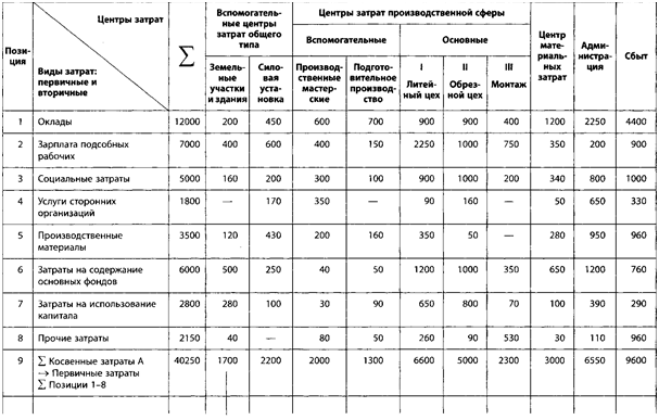Основным вспомогательным средством расчета затрат по центрам является ведомость расчета. В ней вертикально расположены виды затрат, горизонтально — центры затрат согласно последовательности производственного процесса (рис. 2.6).