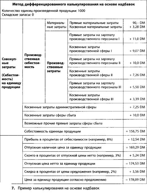 Расчет затрат на единицу продукции (калькуляция) имеет целью опре деление затрат по незавершенному производству или готовой продукции. На этой основе можно рассчитать, например, производственную или полную себестоимость продукта, играющую важную роль при определении цены. Для составления калькуляции используются различные методы, например, очень распространен метод калькулирования на основе надбавок, представленный в примере (рис. 2.7). Кроме того, при гомогенных производственных условиях применяется метод калькулирования на основе деления, а также метод калькулирования на основе коэффициентов эквивалентности (подробное описание методов калькулирования привел Kilger, 1987, S. 305 ff.).