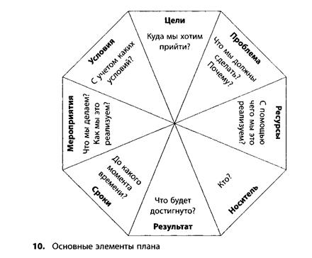 Результатом планирования является план, основные элементы которого представлены в примере (рис. 2.10). Остановимся на целях плана. План — это не прогноз, который ни к чему не обязывает, план служит для четкой постановки целей. Ответственность за выполнение плана определена в самом плане.