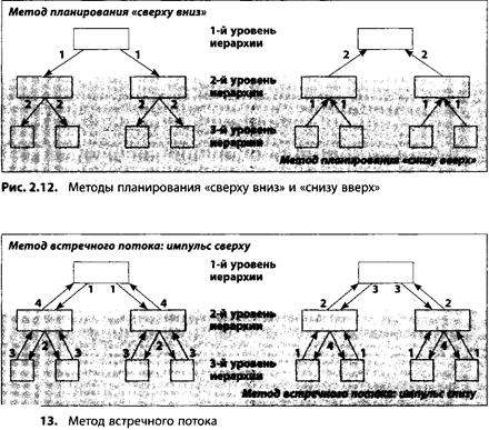 • Метод встречного потока. Этот метод комбинирует ретроградное и прогрессивное планирование. Сначала высшим руководством временно устанавливаются верхние цели. На их основе нижестоящие уровни разрабатывают подцели и подпланы для проверки возможностей реализации этих целей. Затем начинается обратный поток «снизу вверх», в ходе которого планы нижних уровней поэтапно координируются и сводятся воедино. Этот процесс завершается окончательным определением целей и планов со стороны высшего уровня руководства. Но в принципе импульс может исходить и «снизу» (рис. 2.13).