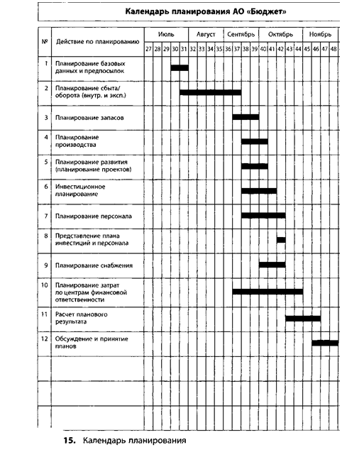Важным компонентом руководства по планированию является календарь планирования. В нем наглядно отражены этапы планирования, которые необходимо реализовать в соответствующие сроки. На рис. 2.15 показан пример календаря планирования для среднего предприятия с дивизиональной организационной структурой.