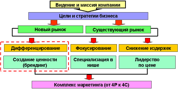 Стратегия маркетинга – это способ действия на рынке, руководствуясь которым предприятие выбирает цели и определяет наиболее эффективные пути их достижения. Цель устанавливает границы и сферы рыночной деятельности (конкурентные преимущества, овладение новым рынком и др.). Пути достижения поставленных целей формируются с помощью выбора стратегических направлений развития и стратегических зон хозяйствования. Соответственно разрабатывается и комплекс маркетинговых средств (товар, цена, реклама и др.). Разработка стратегии маркетинга опирается на прогнозы относительно долгосрочных перспектив развития рынка и потенциальных возможностей предприятия.