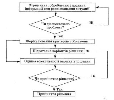 Кожна організація для здійснення ефективної діяльності визначає цілі, досягнення яких можливе лише внаслідок дій, які виконуються в певній послідовності і є способом вирішення окремих, часткових завдань. Так, плануючи майбутню діяльність організації, менеджери визначають її цілі, способи їх реалізації та ресурси, необхідні для їх досягнення. У процесі організації діяльності приймаються рішення щодо організаційної структури, організації виробничого процесу, розподілу робіт та забезпечення їх необхідними засобами тощо. Контроль передбачає прийняття рішень щодо вибору системи контролю (масштабів, періодичності, форм контролю), аналізу отриманої інформації та здійснення коригуючих дій. Від того, наскільки обґрунтованими будуть ці рішення, залежатимуть успіх чи невдача організації, її процвітання чи занепад.