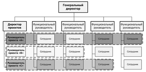 Матричная структура характеризуется управлением по двум направлениям: по вертикали и по горизонтали. По вертикали осуществляется управление специализированными подразделениями по выполнению частей общей работы, соответствующих их специализации, а по горизонтали – координация их деятельности для достижения общей конечной цели (рис. 6).