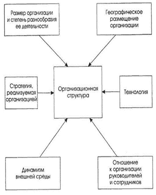Факторами, влияющими на выбор организационной структуры, являются: размер организации, географическое размещение, технология, отношение к организации со стороны руководителей и сотрудников организации, динамизм внешней среды, стратегия, используемая в организации.