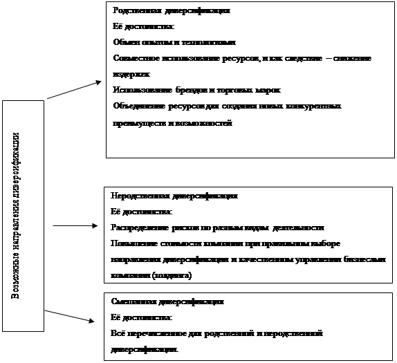 На рисунке 2 указаны самые очевидные и показательные достоинства диверсификации и расширения предприятия в различных направлениях. Но следует учитывать, что диверсификация очень трудоёмкий и сложный процесс, который может принести не только дивиденды, но и проблемы и убытки.