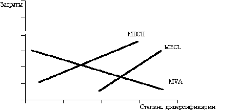 При решении о диверсификации деятельности компании следует учитывать стоимость управления такой компанией. Эти затраты определяются числом СЗХ и необходимостью координации между ними. Так, затраты на управление больше в компании из 12 СЗХ, которые обладают определенным синергизмом, чем в компании из 10 СЗХ, которые не обладают этим качеством. Это иллюстрировано рис.3. Удельные затраты на управление диверсифицированной компании при высокой потребности в координации (МВСН) сравниваются с таковыми для компании с низкой потребностью в координации (МВСL). Предположим, что компания с высокой потребностью в координации стремится усилить свое положение путем синергизма СЗХ. А компания с малыми потребностями в координации следует стратегии внутреннего рынка капитала или реструктурирования. Как видно, на каждом уровне диверсификации соответствующие значения прямых МВСH больше значений МВСL. Если мы примем, что обе компании имеют одинаковые кривые удельных затрат на управление МVA, компания с низкой нуждой в координации имеет рентабельность управления больше, чем компания с высокой нуждой в координации.