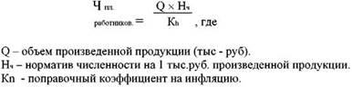 Первый метод расчета плановой численности персонала менее точен. Точность второго зависит от правильности определения профессиональной структуры и разработанных нормативов. Рассмотрим некоторые методы расчета количественной потребности в персонале. Например, от достигнутого уровня численности при базисной производительности труда и планируемого объема продукции определяется по формуле: Ч пл. = Ч баз. × Y о.п., Где Ч баз. – численность работников за предыдущий период; Y о.п. – индекс объема продукции. В экономической литературе предлагается определять плановую численность персонала по формуле:
