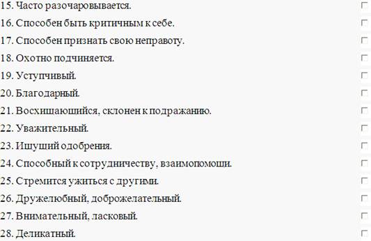 13–16 – покорный, склонный к самоунижению, слабовольный, склонный уступать всем и во всем, всегда ставит себя на последнее место и осуждает себя, приписывает себе вину, пассивный, стремится найти опору в ком-либо более сильном.