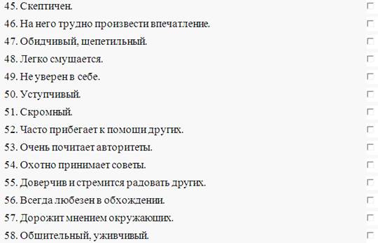 0–8 – скромный, робкий, уступчивый, эмоционально сдержанный, способный подчиняться, не имеет собственного мнения, послушно и честно выполняет свои обязанности.