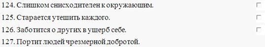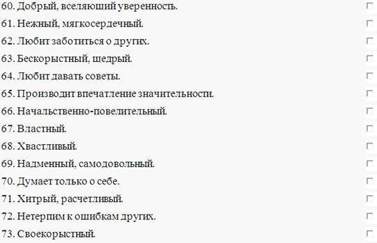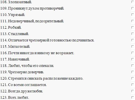 Я сперва оценила себя, свое актуальное "Я" из 128 лаконичных эпитетов (Таблица 1). Каждая из эпитетов-характеристик имеет порядковый номер. Ниже размещены характеристики с фиксацией ответа "да" либо "нет" в checkbox'е справа (отмеченный птичкой пункт означает "да").