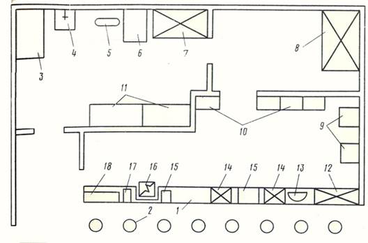 На небольшом предприятии некоторые помещения могут быть совмещены: например, цех для изготовления полуфабрикатов и участок для хранения готовой продукции. Многое, конечно, зависит опять же от характера снабжения, а также от того, как размещен бар – отдельно либо при ресторане, кафе, столовой.