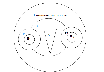 П1 , П2 – деловые партнеры; Е- социальная среда делового общения, включающая в себя объективные факторы; А- предмет делового общения; В- психические процессы межличностного общения деловых партнеров; Р1 ,Р2 - личностное психологическое пространство деловых партнеров.