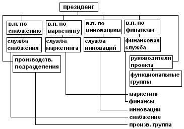 Таким образом, внутри обычной дивизиональной структуры создается многофункциональная группа специалистов, работу которых координирует руководитель проекта, имеющий право руководить специалистами, распоряжаться ресурсами, выделенными на реализацию проекта. Он также несет ответственность за его выполнение перед президентом фирмы. После окончания проекта данная структура ликвидируется. Специалисты переходят в новый проект, либо возвращаются на прежнее место работы, либо увольняются. Создание чистой проектной организации требует значительных затрат и времени. Поэтому создание таких структур целесообразно при реализации долгосрочных проектов длительного действия.