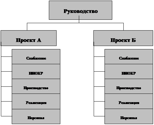 Чистая проектная организация формируется для решения сложной долгосрочной управленческой проблемы, реализации крупномасштабного затратного проекта. Для этого на решении проблемы концентрируются лучшие специалисты из функциональных служб и производственных подразделений, а сама структура имеет следующий вид: [28]