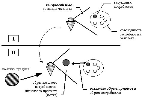 Мотивация (как процесс) – есть процесс эмоционально-чувственного сопоставления образа своей потребности с образом внешнего предмета (претендента на предмет потребности) (см. рисунок 1.2. (II)). Или, мотивация (как механизм) – это внутренний психический механизм человека, который обеспечивает опознание предмета соответствующего потребности и запускает направленное поведение по присвоению этого предмета (если он соответствует потребности). Поэтому, как ни парадоксально, но не совсем корректно говорить о мотивации человека, персонала и т.п. со стороны руководства организации! Можно говорить об организации или управлении мотивацией (мотивационными процессами) человека, персонала и т.п.