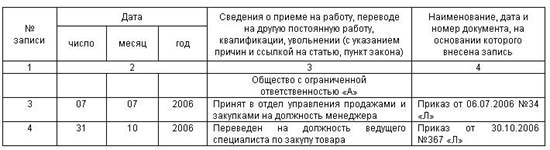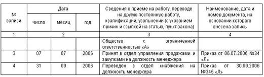 В графе 3 указываются "Сведения о работе" в данной организации, они нумеруются и датируются. Датами записей являются даты приема на работу, перевода на другую работу, увольнения, указанные в приказах (распоряжениях) по личному составу. Номера и даты приказов вносятся в 4-ю графу трудовой книжки. Запись о приеме на работу, представленная на рисунке 7, должна содержать следующее: "Принят или назначен в такой-то цех, отдел, подразделение, участок, производство с указанием их конкретного наименования, а также наименования работы, профессии или должности и присвоенного разряда". Наименования профессий и должностей должны соответствовать штатному расписанию, иным локальным нормативным актам организации, трудовому договору.