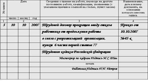 Причины прекращения трудового договора должны указываться в точном соответствии с формулировками ТК РФ или иного федерального закона. При прекращении трудового договора по основаниям, предусмотренным ст. 77 ТК РФ (за исключением случаев расторжения трудового договора по инициативе работодателя и по обстоятельствам, не зависящим от воли сторон), в трудовую книжку вносится запись об увольнении со ссылкой на соответствующий пункт ч. 1 указанной статьи. На рисунке 5 представлен пример записи об увольнении ввиду отказа работника от продолжения работы в связи с реорганизацией организации, п. 6 части первой статьи 77 ТК РФ (4.9.9.)
