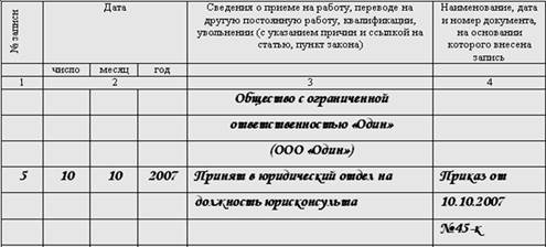 При внесении сведений о приеме на работу неверным является буквальное понимание некоторыми работниками кадровых служб требования о точном соответствии записей о приеме на работу тексту приказа. Например, не следует дословно воспроизводить текст приказа, а также условие о сроке договора, об испытательном сроке, факт работы на условиях неполного рабочего времени – все это обязательно должно быть указано в трудовом договоре и приказе о приеме на работу, но не в трудовой книжке. [22]