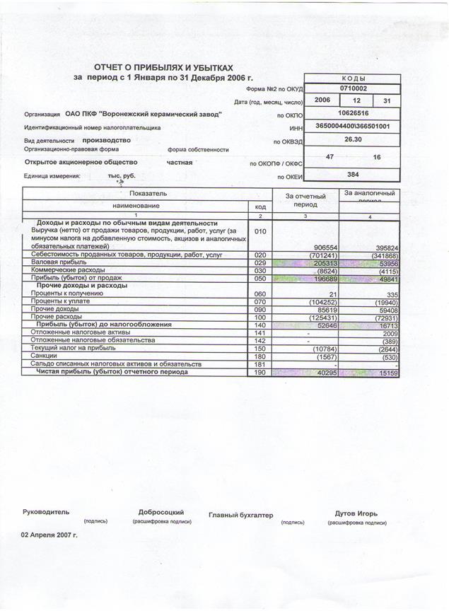 Отчет о прибылях и убытках ф. №2 за 2006 год