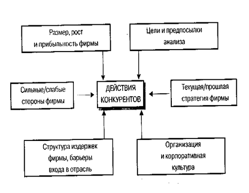 Изучая состояние конкурентной среды при разработке стратегии продукта, фирма должна анализировать не только структуру и динамику изменения конкурентных сил, но и досконально изучать отдельных конкурентов, чтобы по возможности полно представлять стратегию их конкурирующего продукта. При этом обязательно должен приниматься во внимание тот факт, что как сама фирма, так и ее конкуренты действуют в постоянно меняющейся конкурентной среде, в которой может произойти изменение стратегии поведения отдельных субъектов конкуренции, могут появиться новые конкуренты, могут сойти с конкурентной арены отдельные противники и т.п.