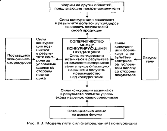 Силы, формирующие конкурентную среду продукта и его конкурентные возможности, распадаются на пять групп. Далее анализ конкурентной среды излагается в соответствии с концепцией стратегии конкуренции М. Портера (Porter, 1980).