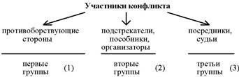 | 2 | Вторые группы | Не стремятся быть замешанными в конфликте непосредственно. | Вносят косвенный вклад в развитие конфликта. В период его нарастания могут стать первичными. |