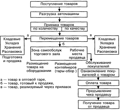В магазинах самообслуживания функции работников торгового зала сводятся в основном к консультированию покупателей, выкладке товаров и контролю за их сохранностью, выполнению расчетных операций. Процесс продажи здесь состоит из следующих основных операций:
