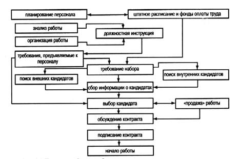 От того, как проведен набор, и какие люди отобраны для работы в организации, зависит вся последующая деятельность в процессе управления человеческими ресурсами. Поэтому, чтобы не создавать дополнительных трудностей, следует отнестись к этому этапу со всей серьезностью, учитывая опыт, накопленный в отечественной и зарубежной практике. Для того чтобы нанять соответствующих работников, нужно в деталях знать, какие задачи они будут выполнять во время работы и каковы индивидуальные и общественные характеристики этих работ. Эти знания получают посредством анализа содержания работы, который является краеугольным камнем управления персоналом. Без него трудно реализовать все остальные функции управления. В основе соответствующего документа лежат определенные соображения о планировании рабочей силы и потребности организации в контроле деятельности менеджеров при наборе персонала в их подразделения [13].
