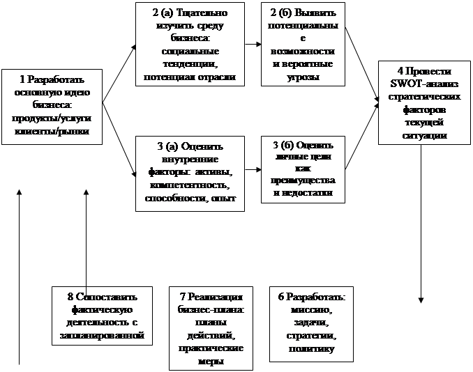 Всякий раз, когда мы обращаемся к долгосрочному планированию бизнеса, это означает, что мы занимаемся стратегическим планированием. Стратегическое планирование – это постоянный процесс, посредством которого руководители малого бизнеса разрабатывают бизнес-стратегии и поддерживают конкурентоспособность своей фирмы на рынке. По мнению Kuratko и Hodgetts, стратегический менеджмент в предпринимательских фирмах представляет собой разработку долгосрочных планов для эффективного использования возможностей внешней среды бизнеса и избегания, проистекающих из нее угроз на основе учета сильных и слабых сторон фирмы.