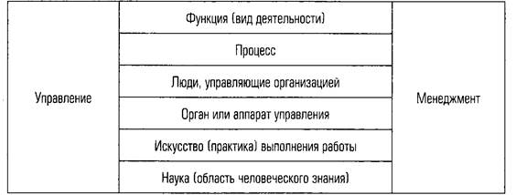 В годы перехода российской экономики на рыночные основы ведения хозяйства наряду с привычным словосочетанием «управление организацией или предприятием» стало нередким и другое - «менеджмент организации или предприятия». В настоящее время они чаще всего используются как понятия идентичные, взаимозаменяемые. Основанием для этого является одинаковая сущность категорий, выражаемых русским словом «управление» и английским «менеджмент» (management). Это находит отражение в определениях данных понятий в фундаментальных работах отечественных и зарубежных авторов, где раскрывается их содержание.