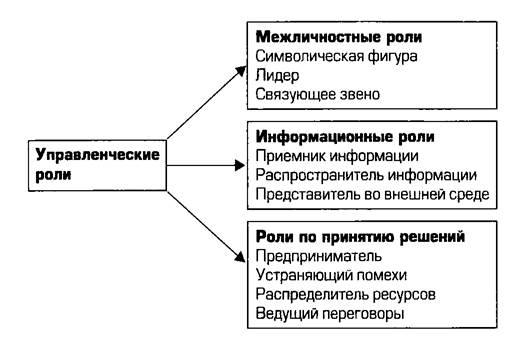 Чтобы соответствовать огромному количеству требований, которые предъявляются к менеджерам, им приходится брать на себя сложные, многоцелевые роли. Роль вообще - это организованный комплекс моделей поведения. Генри Минцберг идентифицировал 10 ролей, проявления которых можно найти в работе любого менеджера[16] . Их можно распределить по трем группам: межличностные, информационные, связанные с принятием решения. Информационные роли объединяют всю менеджерскую деятельность. Эти роли могут использоваться одним и тем же менеджером в различное время в зависимости от уровня и функций управления. Каждая из десяти ролей описывается индивидуально, но все они вместе составляют одно целое.