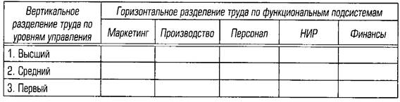 Более глубокое горизонтальное разделение труда менеджеров предполагает их специализацию по ключевым сферам деятельности, образующим подсистемы предприятия. В табл. 2 приведен пример такого разделения труда на предприятии, в составе которого выделены пять подсистем: маркетинг, производство, персонал, исследования и разработки, финансы.
