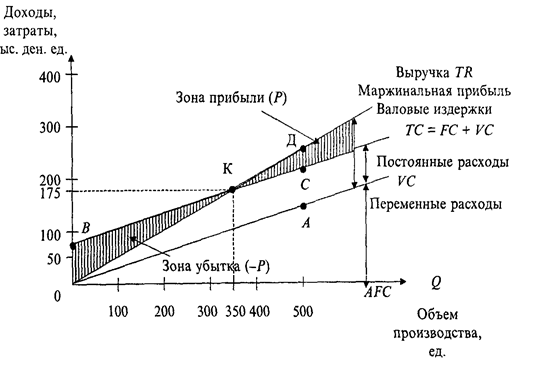 Слева от критической точки заштрихована область чистых убытков, которая образуется в результате превышения величины постоянных издержек над величиной маржинальной прибыли. Справа от нее заштрихована область чистых прибылей. Для каждого значения Q (количества единиц продукции) чистая прибыль определяется как разность между величиной маржинальной прибыли и постоянных издержек.