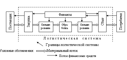 При выборе тактики и стратегии логистической системы необходимо четко определить границы логистической системы. Границы логистической системы определяются циклом обращения средств производства (рис.1.1). Они, в виде материального потока, поступают в логистическую систему, складируются, обрабатываются, вновь хранятся и затем уходят из логистической системы в потребление в обмен на поступающие в логистическую систему финансовые ресурсы.