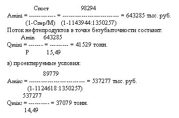 Как видно из приведенного графика, точка безубыточности сдвинется влево и поток нефтепродуктов в точке безубыточности в существующих условиях (Qmin1) в проектируемом варианте уменьшится (Qmin2).