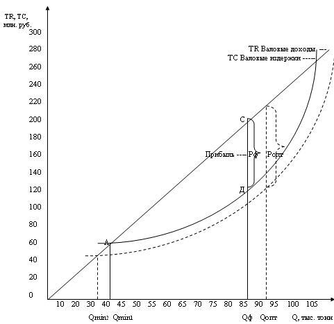 Прибыль достигается при разности валовых доходов (TR) и валовых издержек (TC) и показана линией СД (рис. 3.2).