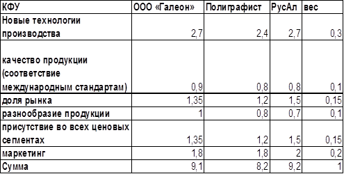 Проанализировав компании ООО «Галеон» и ООО «РусАл», можно сделать вывод, что РусАл опережает ООО «Галеон» по некоторым КК, однако разнообразие и качество продукции компании ООО «Галеон» сильнее.