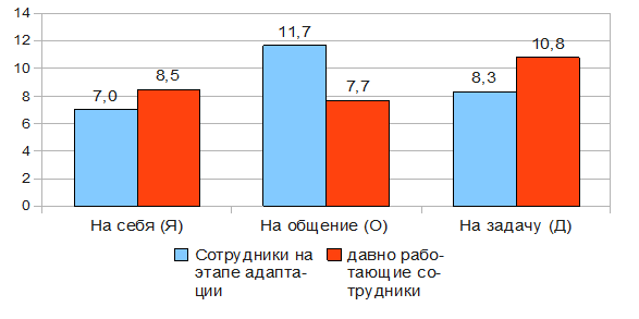 Среднее значение выраженности показателя мотивационной направленности на задачу у сотрудников в период адаптации составляет 8,3 балла, а у сотрудников со стажем работы в данной организации более трех лет - 10,8 баллов.