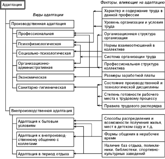 Адаптация – процесс активного приспособления человека к изменившейся среде с помощью различных социальных средств. Основным способом адаптации является принятие норм и ценностей новой социальной среды (группы, коллектива, организации, региона, в которые входит индивид), сложившихся здесь форм социального взаимодействия (формальных и неформальных связей, стиля руководства, семейных и соседских отношений), а также форм и способов предметной деятельности (например, способов профессионального выполнения работ, либо семейных обязанностей) [12].