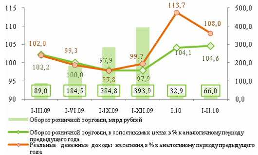 Основные тенденции социально-экономического развития Санкт-Петербурга в январе-феврале 2010 года . В феврале продолжился рост потребительского спроса, наблюдаемый с начала года. По отношению к январю-февралю 2009 года оборот розничной торговли увеличился на 4,6% и составил 66 млрд. рублей.