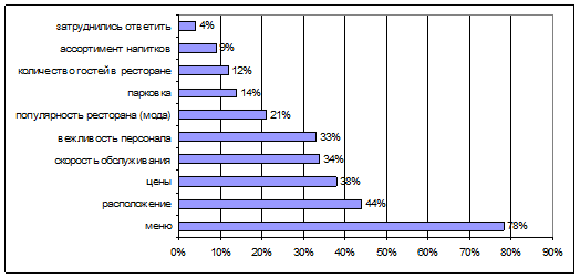 Потребители, выбирая ресторан для посещения всей семьей, больше всего обращают внимание на «стоимость блюд» – 83% респондентов отметили этот фактор как наиболее значимый. На втором месте, по значимости, – «вкусовые качества блюд» (66% респондентов). Третье место занимает «качество обслуживания в ресторане» (61,7% респондентов).