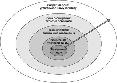 Обратимся к рис. 7.8. Товарные марки ограничены периметром возможностей линейных расширений вокруг внутреннего ядра. Трудно представить, что марка “Persil” вдруг выйдет за рамки моющих средств, “Whiskas” - за рамки корма для кошек. Потребители вряд ли оценят, если под этими марками будет выпущен шоколад или начнут предлагаться финансовые услуги. Марки-устремления, и особенно “опытные” марки, менее ограничены. Марка-опыт во многих случаях может выйти за пределы товарной линии во внешнее ядро, где у потребителей будут возникать спонтанные ассоциации с ней, а затем и в более широкие области скрытого потенциала, удовлетворяющие ядру марки и не являющиеся запретными.