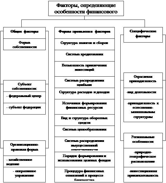 Факторы, обуславливающие особенности финансового механизма холдингов, подразделяются на общие, обусловленные формой собственности и организационно-правовой формой, и специфические, обусловленные отраслевой принадлежностью и региональными особенностями (рис. 1).