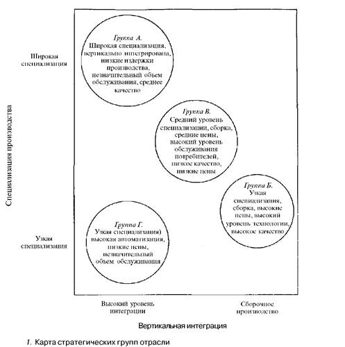 Структурный анализ отрасли основан на выявлении источников и масштабов пяти общих конкурентных сил, определяющих характер конкуренции в отрасли, а также лежащую в ее основе потенциальную прибыль. До сих пор в центре исследования находилась отрасль как целое, и анализ позволил сделать выводы, важные для конкурентной стратегии. В то же время, очевидно, что отраслевой структурный анализ может быть применен на более глубоком уровне, чем уровень отрасли в целом. Во многих, если не в большинстве отраслей, можно наблюдать фирмы, которые приняли различные варианты конкурентной стратегии по таким направлениям, как производственная специализация, вертикальная интеграция и т.д., и достигли различных показателей доли рынка. Кроме того, некоторые фирмы на протяжении длительного периода превосходят другие по уровню прибыли на инвестированный капитал. Например, у IBM этот показатель был всегда выше, чем у других производителей универсальных вычислительных машин. GeneralMotors в течение длительного времени превосходила Ford, Chrysler и АМС. В некоторых отраслях более мелкие фирмы имеют лучшие показатели, чем крупные, например, CrownCorkandSeal и NationalCan в консервной промышленности, EsteeLauder в косметической.