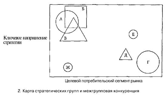 Таким образом, стратегические группы влияют на характер конкуренции внутри отрасли. Этот процесс схематически иллюстрируется с помощью карты стратегических групп, представленной на рис. 2, который аналогичен рис. 1, за тем исключением, что горизонтальная ось в данном случае соответствует показателю целевого потребительского сегмента стратегических групп, отражающему степень их рыночной взаимозависимости. Вертикальная ось представляет другую важнейшую характеристику стратегии в отрасли. Стратегические группы обозначены фигурами с буквенными символами, их размер пропорционален совокупной доле рынка фирм, входящих в группу. Различные типы фигур обозначают общую конфигурацию стратегии соответствующих групп, отображая тем самым стратегическую дистанцию между ними. Применяя описанную выше методику анализа, можно отметить, что группа Г будет значительно меньше подвержена конкурентной борьбе в отрасли, чем группа А. Группа А конкурирует с такими же крупными по величине группами Б и В, которые следуют разным стратегиям в одном и том же основном потребительском сегменте. Фирмы, входящие в эти три группы, находятся в условиях постоянного соперничества. В то же время группа Г действует в другом сегменте рынка и конкурирует здесь наиболее интенсивно с группами Д и Е, которые меньше по величине и придерживаются сходных стратегий производителей, проводящих «круговую» стратегию или близкие к ней варианты).
