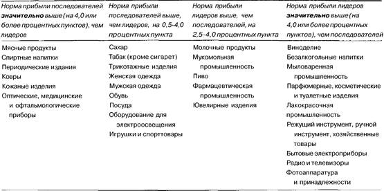 Эмпирические данные свидетельствуют о том, что соотношение между прибыльностью фирм, имеющих различную долю рынка, зависит от условий в отрасли. В табл. 1 представлены сравнительные показатели нормы прибыли на акционерный капитал крупнейших фирм, на долю которых приходится не менее 30% объема продаж в отрасли, и средних по масштабам фирм той же отрасли. В этих расчетах мелкие фирмы с активами менее 500 тыс. долл. были исключены. Несмотря на то что некоторые из представленных отраслей определяются весьма широко, поразительным является тот факт, что в 15 из 38 отраслей последователи были заметно более прибыльны, чем лидеры. Норма прибыли последователей, как правило, оказывается выше в тех отраслях, где экономия на масштабе либо незначительна, либо отсутствует и/или которые характеризуются высокой степенью сегментации. Норма прибыли лидеров, как правило, выше в отраслях с интенсивным использованием рекламы и/или с масштабными исследованиями и разработками и экономией на масштабе в производстве. Эти данные соответствуют нашим ожиданиям.